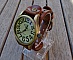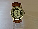 Montre vintage pour homme ou femme au gros cadran bronze de forme ronde et gros chiffres bien lisibles, avec un bracelet en cuir couleur camel style vintage, bien large.